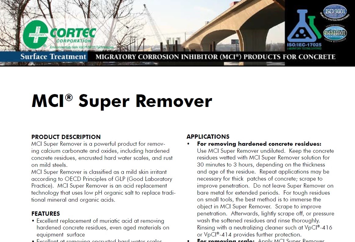 Cortec® is introducing MCI® Super Remover, new powerful cleaner for removing rust, scale, and hardend concrete residues. Super Remover is an excellent replacement for muriatic, phosphoric, and nitric acid cleaners, removing even aged concrete residues from equipment surfaces! This advanced technology uses low pH organic salt to replace traditional mineral and organic acids. The product is approved by the US EPA as a non-food inert ingredient in biocide applications. Phosphate free MCI® Super Remover is biodegradable, nonfuming, and contains no VOCs making it safer for both the environment and humans than the caustic cleaners it replaces. MCI® Super Remover does not damage the painted surface of moisture-cured aliphatic urethane paints, common uncoated glass surfaces, fiberglass, and rubber. MCI® Super Remover is excellent for ready - mix trucks and batching plants applications. The product is also very effective at removing both rust and hard water scale from mild steel without causing further corrosion.