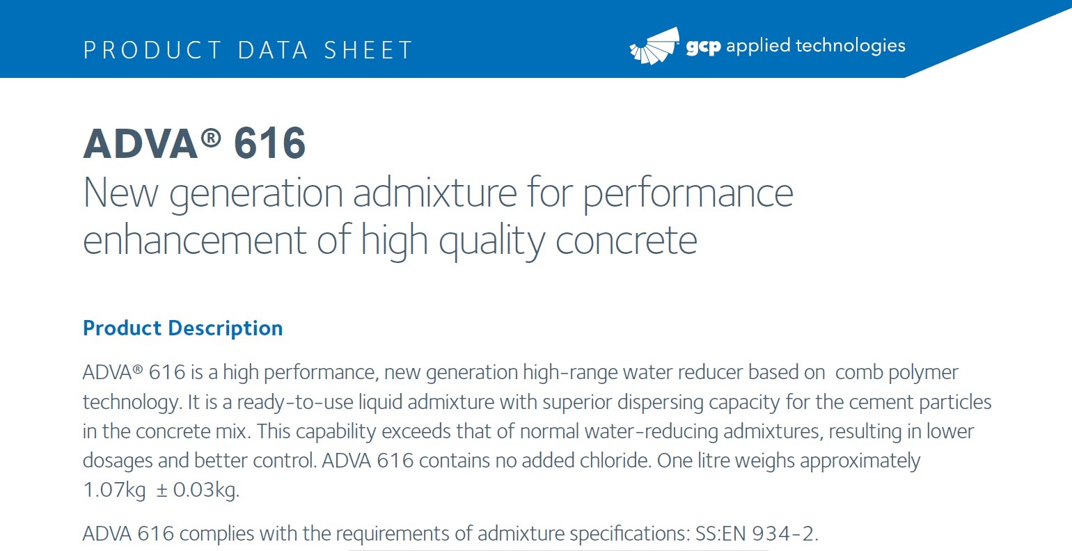 ADVA® 616 is a high performance, new generation high-range water reducer based on comb polymer. It is a ready-to-use liquid admixture with superior dispersing capacity for the cement particles in the concrete mix.This capability exceeds that of normal water-reducing admixtures, resulting in lower dosages and better control technology ADVA 616 contains no added chloride. One litre weighs approximately 1.07kg ± 0.03kg.ADVA 616 complies with the requirements of admixture specifications: SS:EN 934-2. Excellent slump control and slump retention are necessary properties of any high quality concrete. ADVA 616 is a tailor-made admixture that helps concrete achieve excellent slump retention for all ranges of design workability. ADVA 616 is very highly effective in enhancing workability and slump retention even in mid-slump concrete and concrete with manufactured sand (crush granite fines), where conventional admixtures have difficulties achieving these properties.